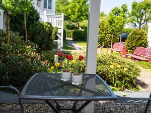 Auf Ihrer möblierten Terrasse, die Sie vom Wohnzimmer aus betreten, schauen Sie in den schön angelegten Gemeinschaftsgarten mit einem kleinen Goldfischteich, Büschen, Bäumen und Rasenflächen.