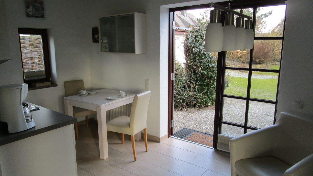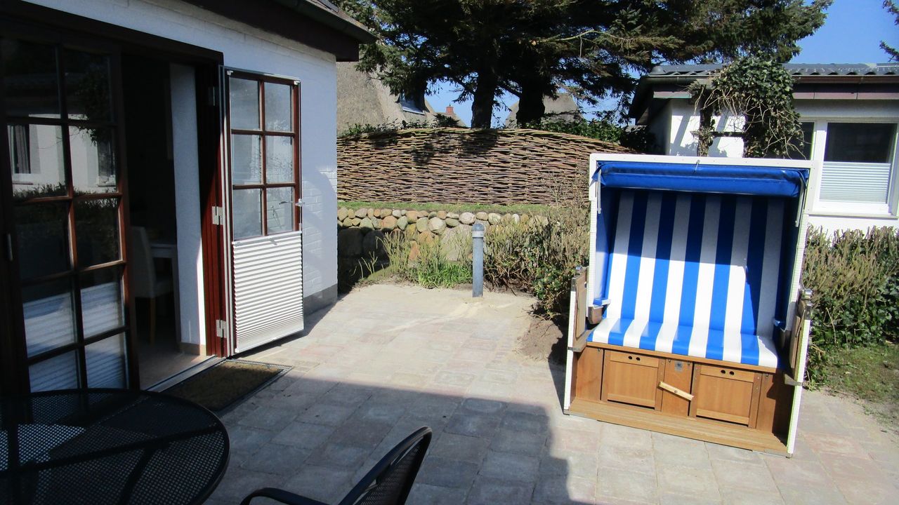 Die Wohnung hat einen eigenen Eingang . Zur eigenen Terrasse gehören Gartenmöbel und der Strandkorb.