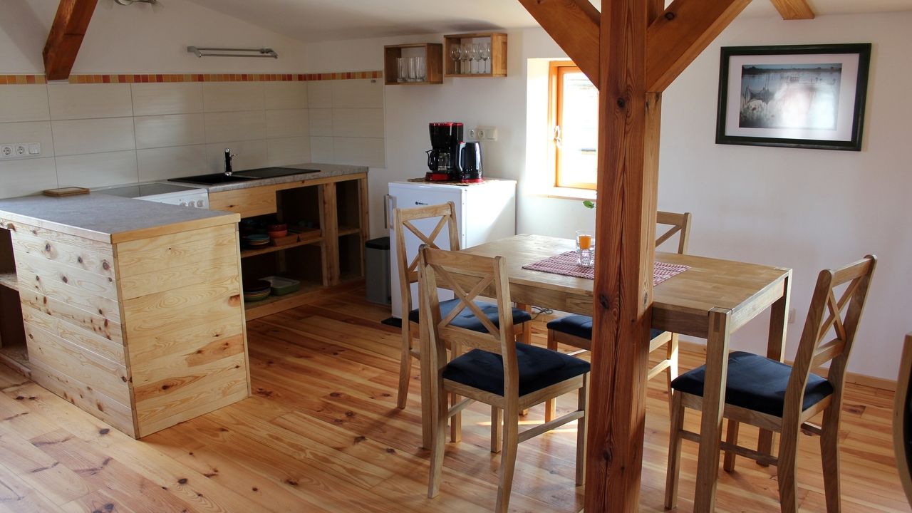 Das ruhig gelegene Appartement mit einem separatem Schlafzimmer liegt über der Kunstgalerie des jetzigen Kanuhofes. Es hat einen separaten Eingang. Im großzügigen sonnigen Wohnbereich von 43 m² befinden sich neben gemütlicher Fernseh- und Leseecke auch die gut ausgestattete Küchenzeile mit Esstisch sowie ein Doppelbett, das mit einem Vorhang abgetrennt werden kann. Das Schlafzimmer ist mit einem Etagenbett ausgestattet. Ein modernes Bad mit WC und Dusche sind selbstverständlich vorhanden. Die Räume sind mit Holzmöbeln im skandinavischen Stil eingerichtet. Auf dem weitläufigen Hof laden Sitzgelegenheiten zum Entspannen ein. Die rustikale Sitzecke im Gartens bietet auch die Möglichkeit, einen Grill zu nutzen.