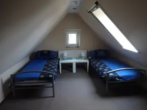 Ein Schlafzimmer mit Doppelbett und ein Schlafzimmer im DG / 2.OG mit 2 Einzelbetten.