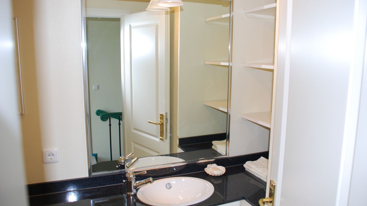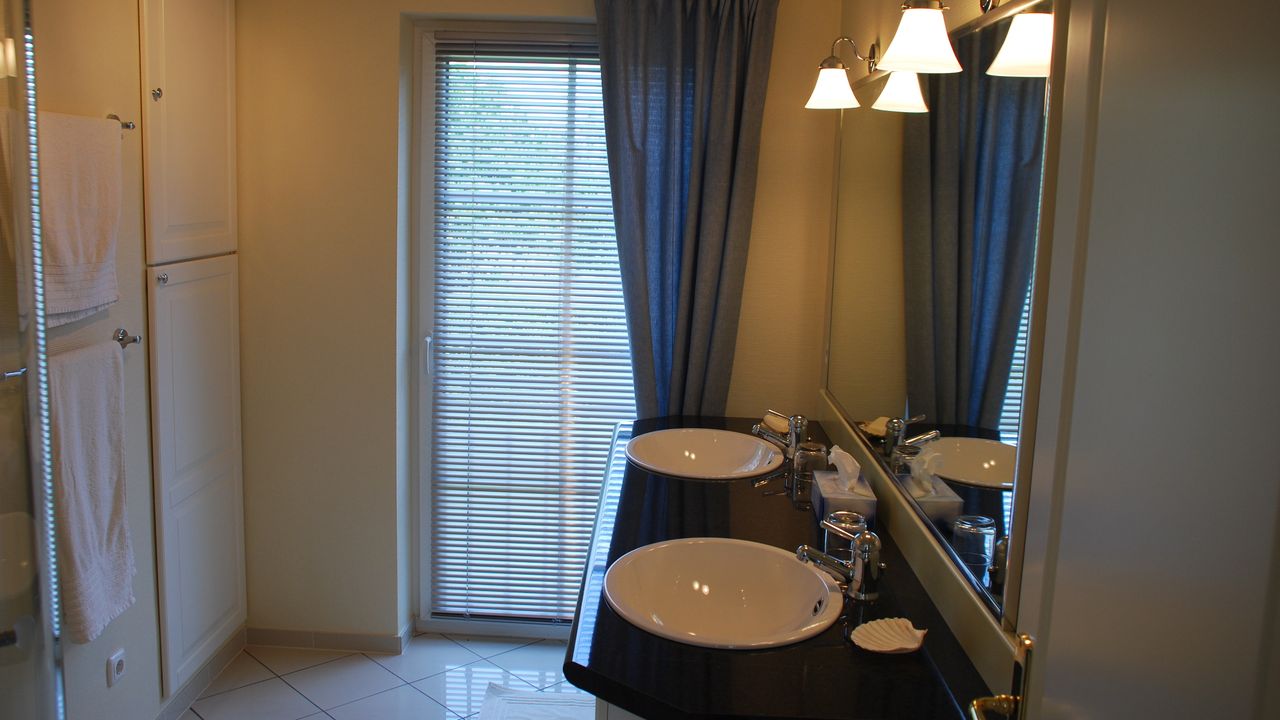 Das großzügige Badezimmer ist mit zwei Waschbecken und einer großen Dusche ausgestattet.