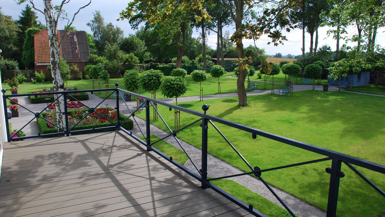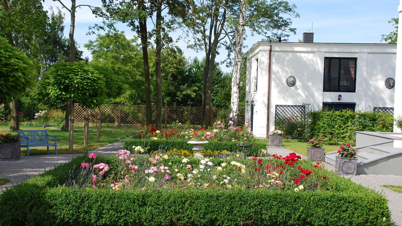 die Sonnenseite pur und einen bezaubernden Blick auf den parkähnlichen Garten und über weite Felder und Wiesen.