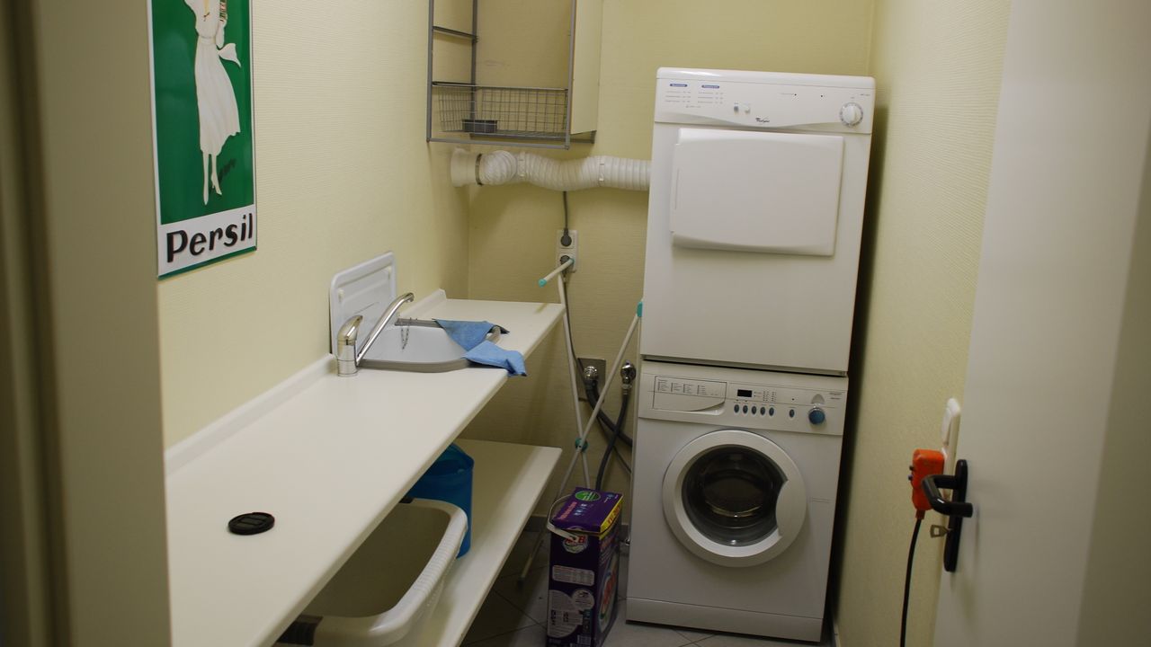 Im Parterre neben dem Flur führt eine Tür in den Wäscheraum mit Waschmaschine und Trockner.