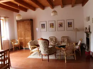 Im Erdgeschoss gibt es einen großen Wohn- und Essraum, im Dachgeschoss drei Zimmer mit schrägen Wänden (36qm) mit 3 Betten und zwei kleinen Einzelzimmern von 5 und 6 qm. 3 zusätzliche Ausziehmöbel sind vorhanden und nur für kletterfähige Kinder (ab ca 8-9 Jahren), ein "Schwalbennest" unter dem Giebel mit 2 Futonbetten, dazu 1 Bad/WC und ein Gäste-WC, einen Sitzplatz vor dem Haus und eine Wiese, wo sich auch die Sauna befindet. Im Erdgeschoss ist ein 36 qm Wohnraum mit offenem Kamin und einer Liege. Kissen und Decken sind sechs Mal vorhanden.Beschreibung der Unterkunft