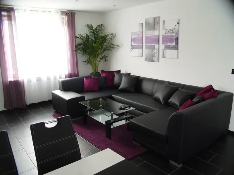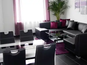 Das gesamte Wohnzimmer ist ca. 30 qm groß, wovon etwa 6 qm einen Büro-/Arbeitsbereich, in Form einer dezenten, offenen Nische, darstellen. Die restlichen 24 qm laden Sie ein, auf dem 50″ Flachbildschirm, SAT TV oder einen spannenden BluRay 3D Film zu geniessen. Die Wohnwand ist mit einem LED-System ausgestattet, bei dem Sie Ihre Wunschfarbe frei einstellen können, um das optimale Wohlfühlambiente zu erhalten.