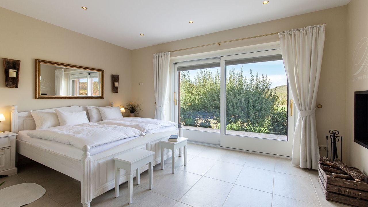Das Hauptschlafzimmer mit Panoramablick über die Natur einem Flat TV und einem Tunnelkamin am Fussende bietet Gemütlichkeit pur.