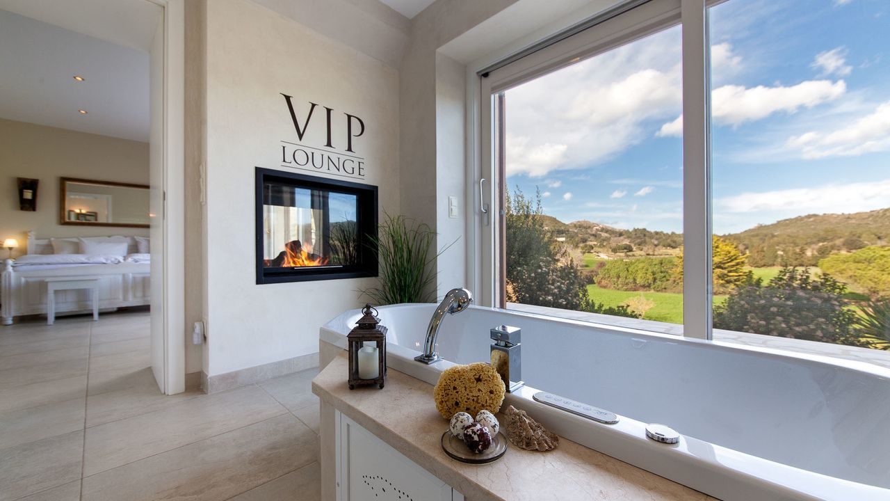 Das angrenzende Badezimmer mit freistehender Badewanne, Kamin, WC, Waschbecken mit hochwertigen Tischlereinbauten und großzügiger, ebenerdiger Dusche mit traumhaftem Blick ist einfach großartig..