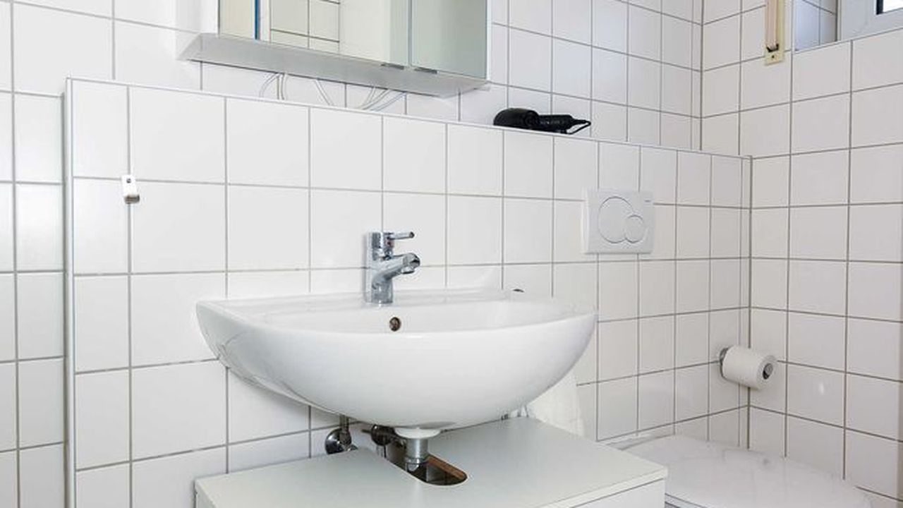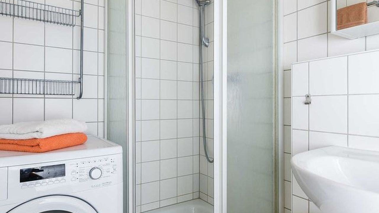 Badezimmer mit Dusche, Waschtisch und WC