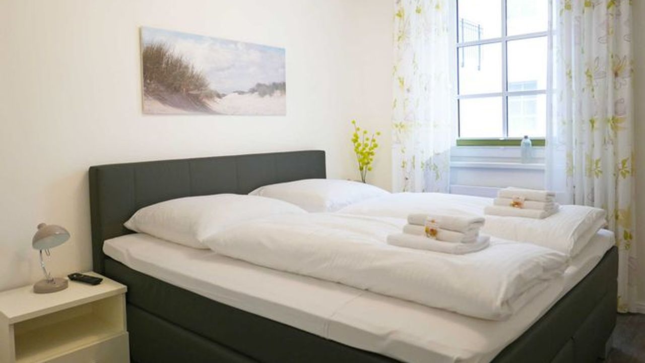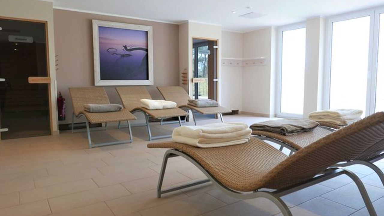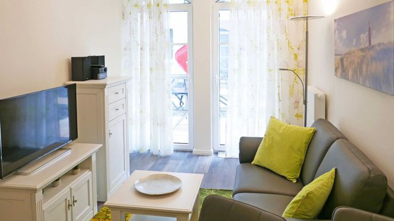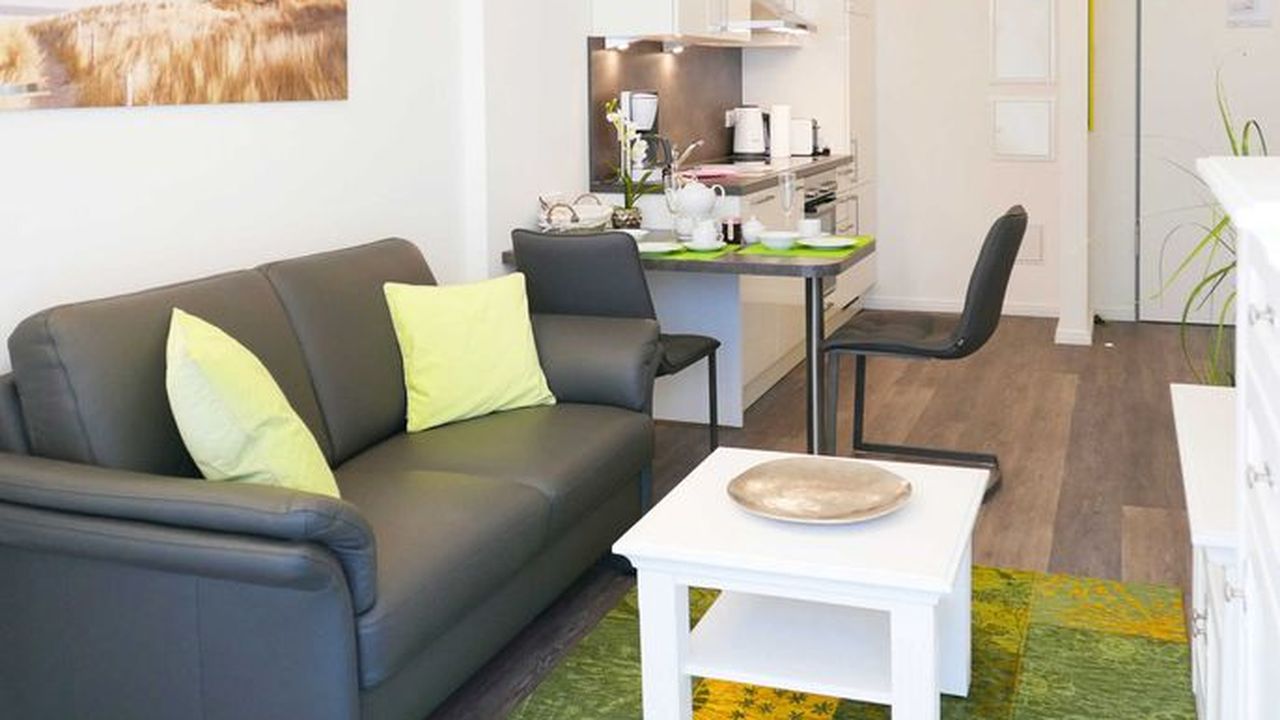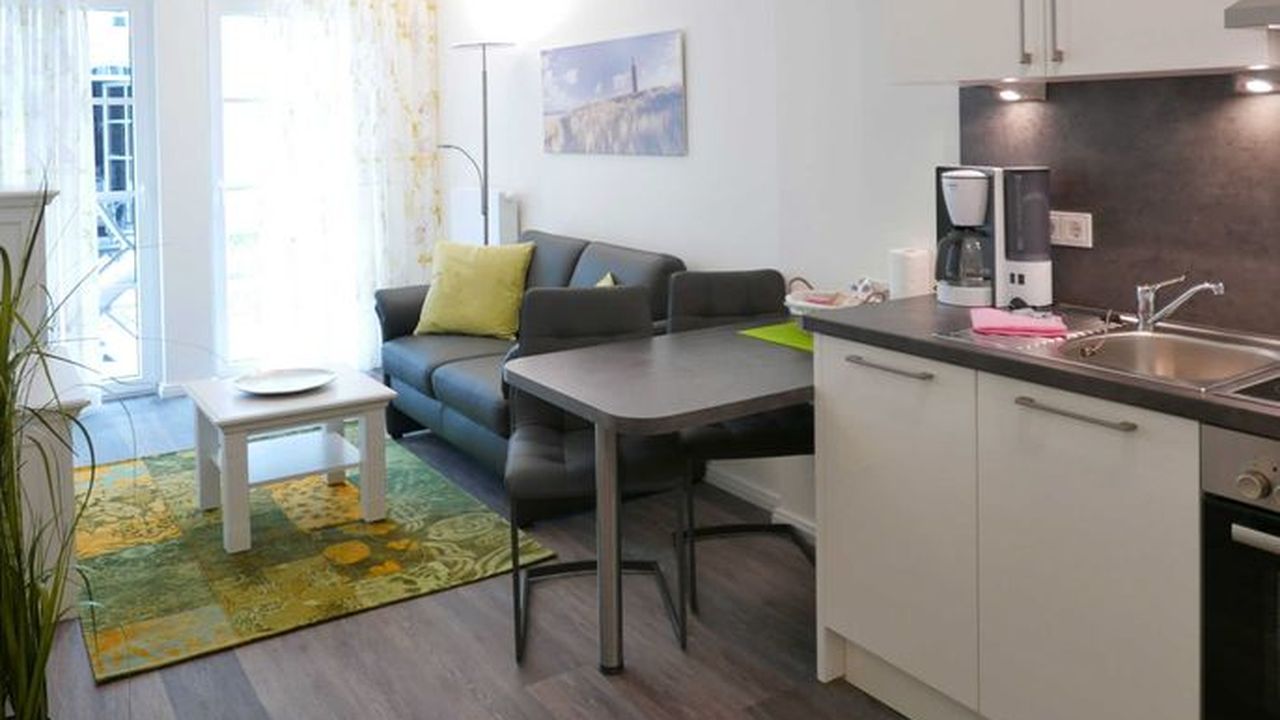 Freundliche 2-Zimmer-Ferienwohnung für 2 Personen mit geräumigem Wohn-/Esszimmer und hochwertigem Boxspingbett im Schlafzimmer.Die Wohnung ist im Haus Meeresblick gelegen, von hier haben Sie einen direkten Zugang zum Strand. Das Haus ist mit einem Fahrstuhl, einer Tiefgarage und einem großen Wellnessbereich mit Schwimmbad (ca. 8,00 m x 4,00 m - 1,35 m tief), zwei Saunen (eine finnische Sauna/eine Bio-Sauna) und einem Massagebereich ausgestattet.