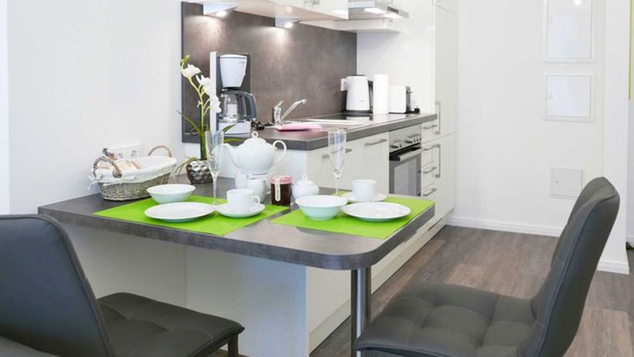 Der Wohn-/Essbereich verfügt über eine moderne Küchenzeile, einem Essplatz sowie einem gemütlichen Sofabereich und Zugang zu der Terrasse. Zwei Flachbildfernseher sind ebenfalls vorhanden. Grüne Farbakzente sorgen für eine freundliche Atmosphäre. Genießen sie den Blick ins Freie von der schönen kleinen Terrasse.