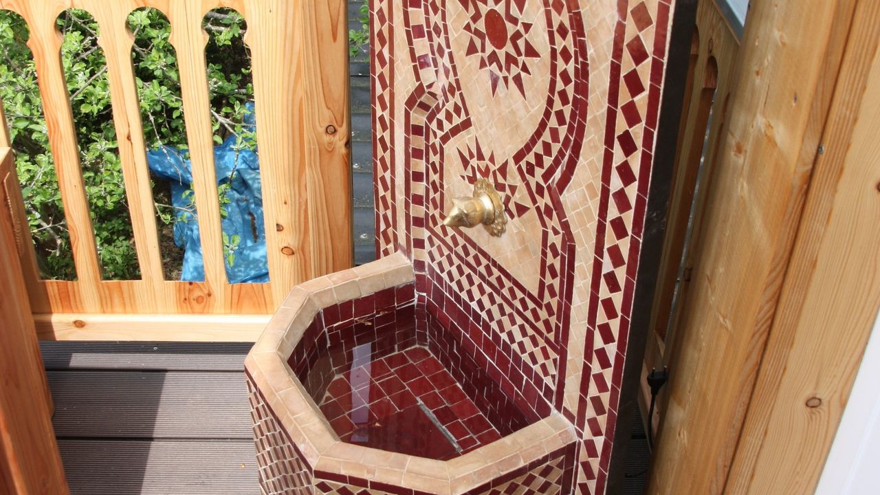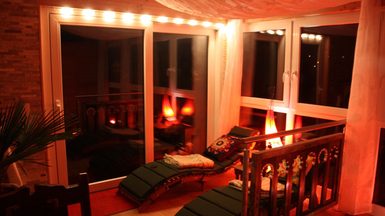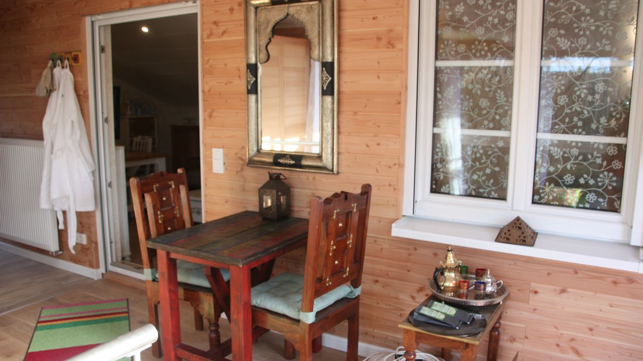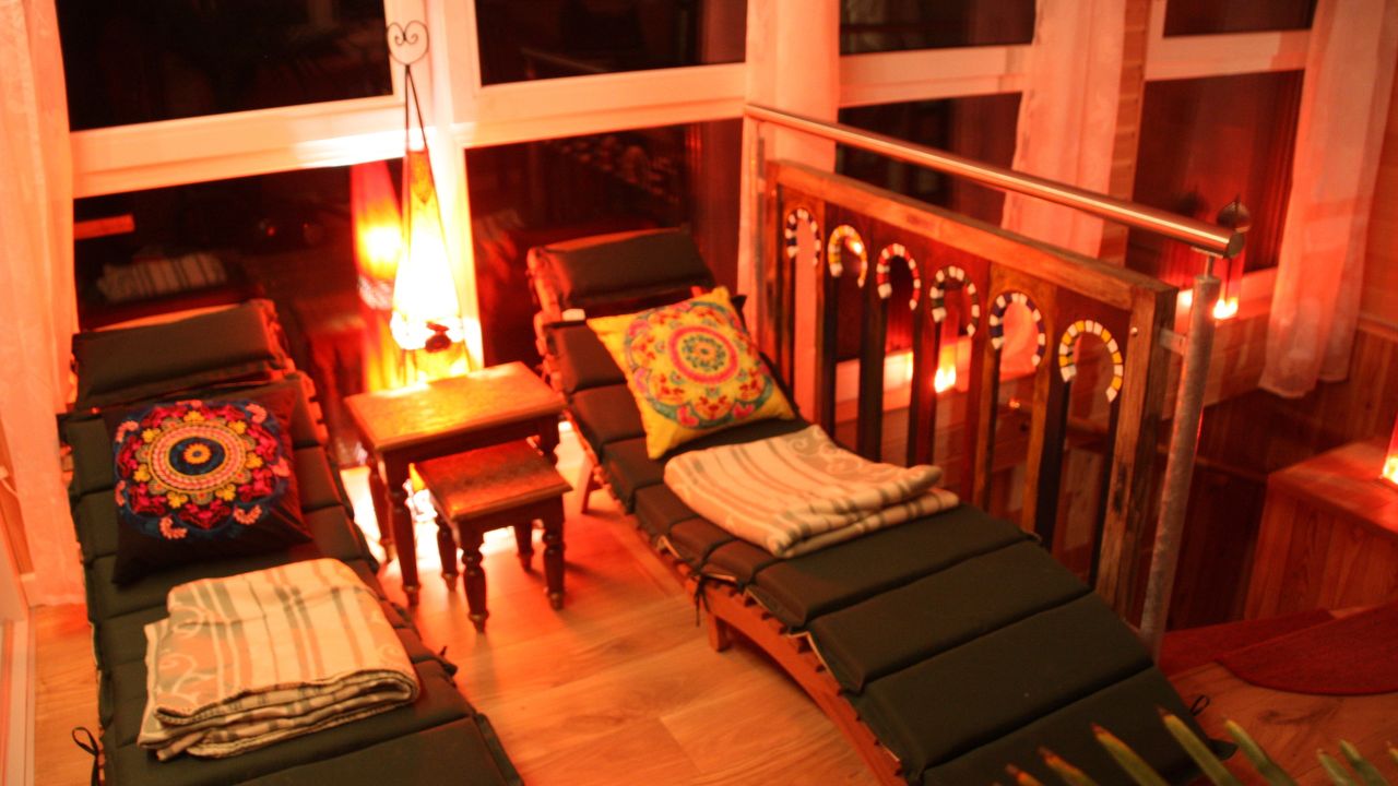 Das Highlight der Ferienwohnung, ist die Sunset Lounge, die im orientalischen Stil eingerichtet ist und über eine 7 qm große, moderne Sauna verfügt. Der Steuerung des Saunaofens, der Beleuchtung und der Musikanlage zur Tiefenentspannung erfolgt kinderleicht über ein Touchscreen Display.