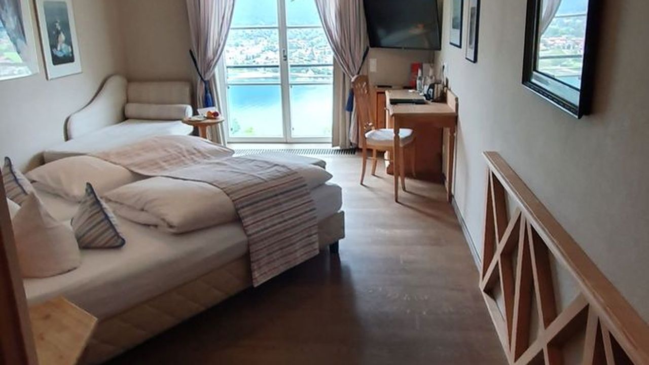 Doppelzimmer (Doppelbett mit zwei getrennten Matratzen) mit französischem Balkon zur Seeseite und dem einmaligen Blick über den Tegernsee und die umliegenden Berge; Sie genießen ein täglisches Auffüllen der Minibar und frisches Obst (im Preis inbegriffen); Die Badezimmer (Dusche/WC) sind ausgestattet mit Produkten der Linie Pure Herbs, Wohlfühlbademänteln, Fußbodenheizung und Haartrockner; Kostenloses WLAN, Flatscreen-TV und Zimmersafe runden das Angebot abSonstiges