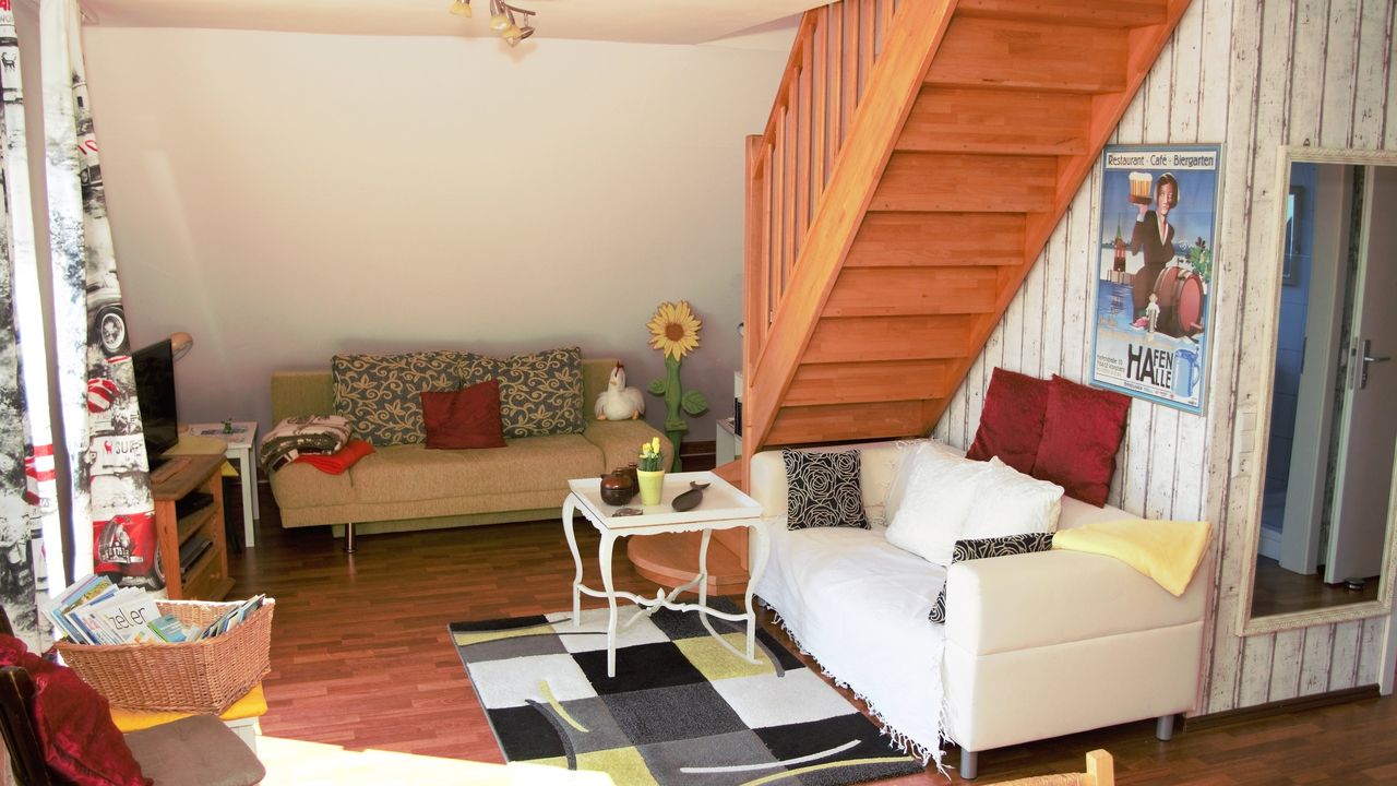 2 getrennte Schlafzimmer mit jeweils 1 Doppelbett bzw. 2 Einzelbetten.Wohnung über zwei Ebenen (Obergeschoss und Dachgeschoss) mit Treppe zu 2. Schlafzimmer.