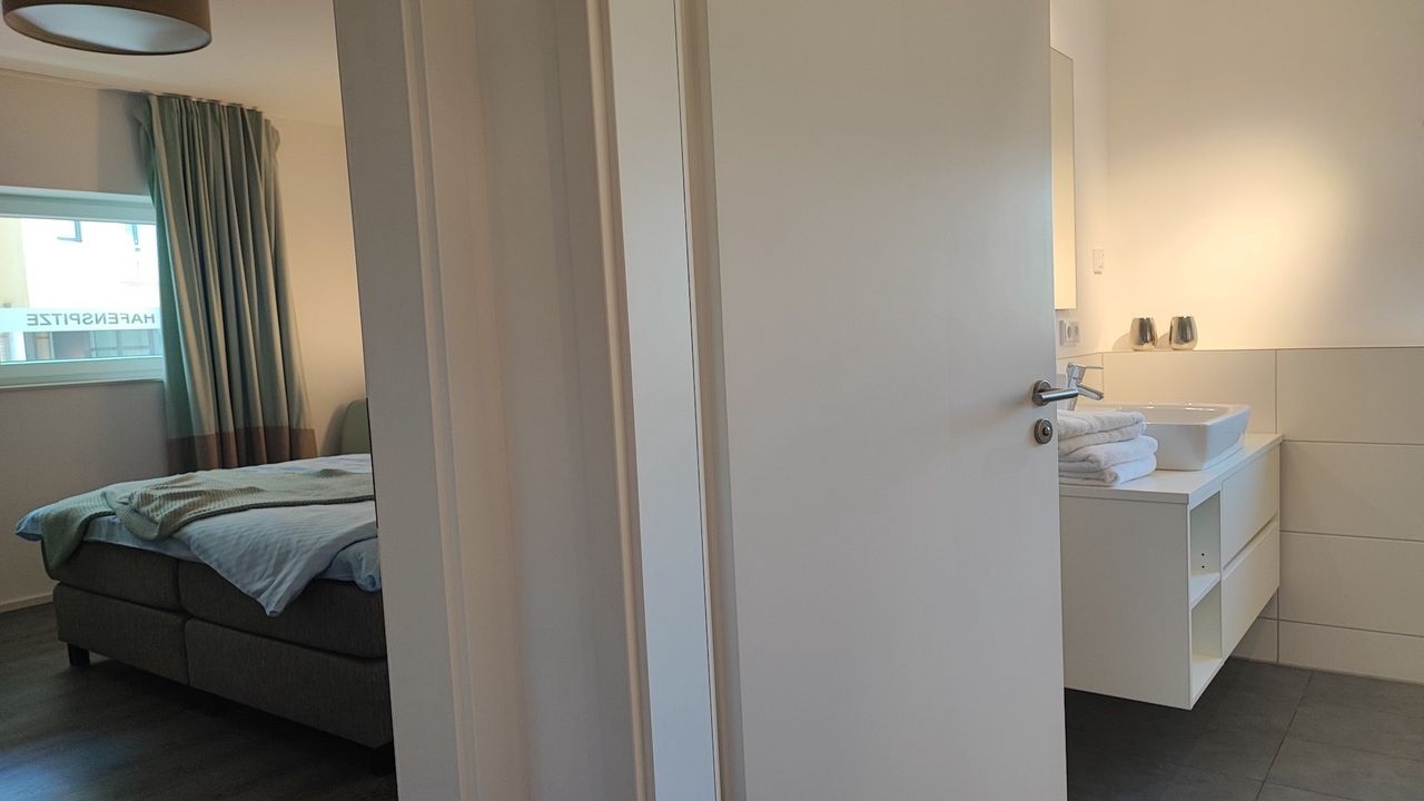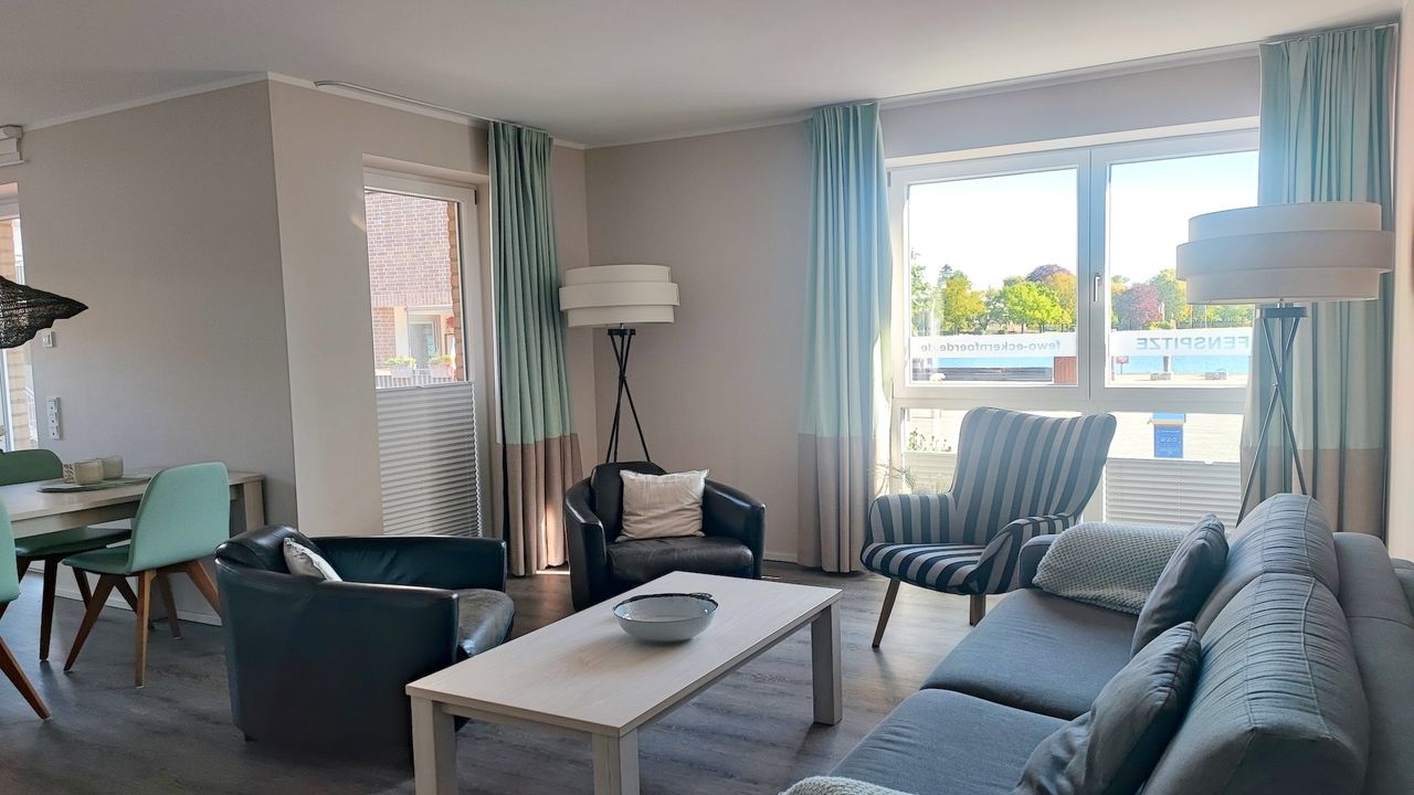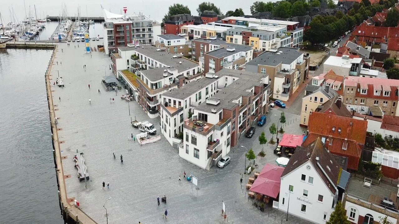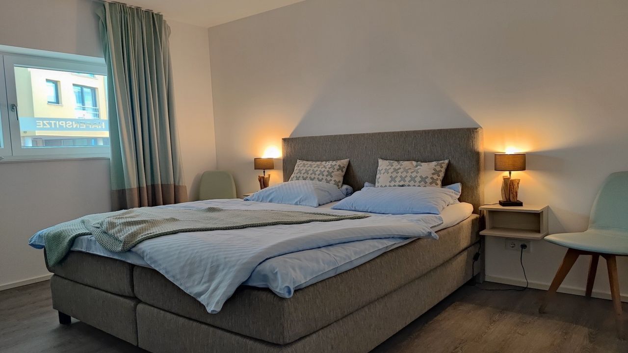 Die Ferienwohnung "Hafenspitze" (Bj. 2018, 4-Sterne) liegt nur 25m von der Hafenpromenade entfernt, auf der einen Seite schließen sich der Strand und seine lange Promenade an, auf der anderen Seite können Sie das Stadtzentrum und die naheliegende Gastronomie in wenigen Minuten erreichen.Der stilvoll eingerichtete, großzügige Wohn- und Essbereich, mit voll ausgestatteter Küche, lädt zum gemeinsamen Entspannen und Kochen ein! Die Ferienwohnung verfügt über einen Balkon mit wunderschönem Blick auf das Hafenbecken. Beide Schlafzimmer wurden mit modernen Doppelbetten (180x200 und 160x200), Kleiderschränken und TV-Geräten ausgestattet. Die Schlafzimmer bieten somit die gewünschte Erholung! Die Duschen in beiden Badezimmern sind ebenerdig. Die komplette Wohnung ist mit Vinylboden und Fußbodenheizung ausgestattet. Die im Hochparterre des Appartementhauses gelegene Ferienwohnung kann ''barrierefrei'' über einen Aufzug, mit direktem Zugang aus der Tiefgarage erreicht werden.