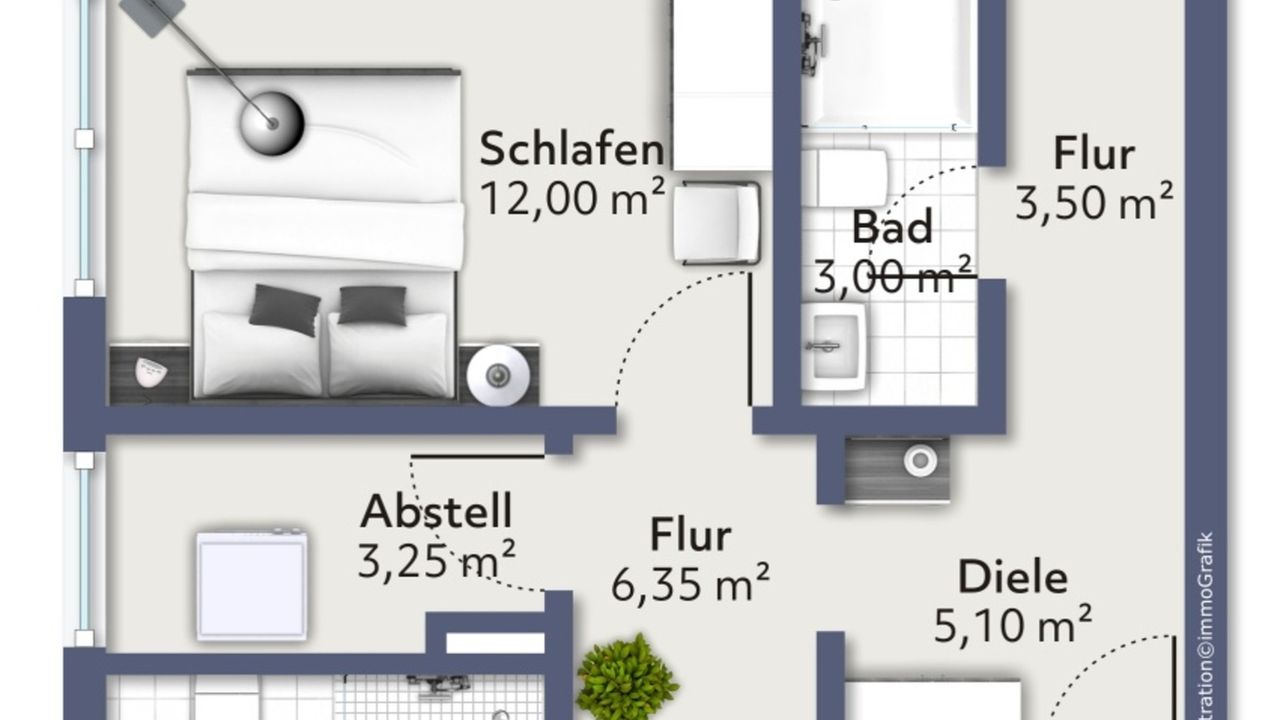 Die Symbole vom Wohngrundriss können in der Darstellung von der tatsächlichen Innen- und Außengestaltung der Wohnung abweichen!