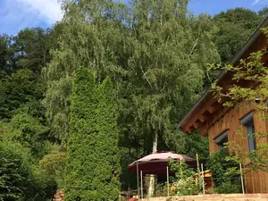 Die „Holzhauszeit“, ein Ferienhaus, das Familienurlaub ganz neu definiert. Bisher mußten Sie sich oft entscheiden zwischen luxuriösem Ressort mit Spa-Bereich und.... einer günstigen Ferienwohnung. Hier können Sie beides in einem genießen.Die urige Außenansicht der großen Tannenstämme und der Lärchenverschalung gibt der Holzhauszeit einen Hüttencharakter. Innen setzt sich dieser mit einem offenen Dachstuhl mit Schwadenbrettern fort. Der zentral in der Mitte des Raumes stehende Stamm mit Ästen vermittelt den Eindruck einer Forsthütte. Die offene Galerie mit Fenster zum Wald ist ein bevorzugter Platz zum Lesen und Entspannen, oder einfach nur Musikhören.