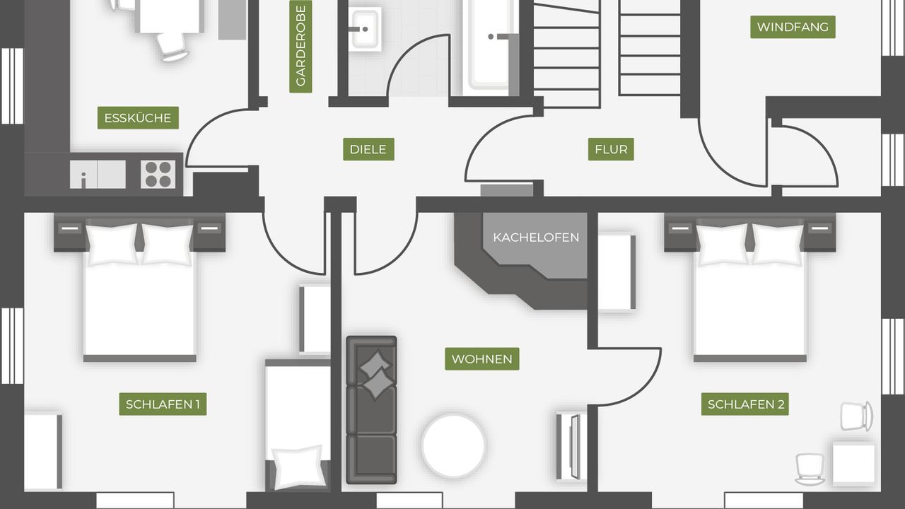 Unsere liebevoll eingerichtete Wohnung mit Balkon verfügt über zwei Doppelzimmer, einer komplett ausgestatteten Echtholz-Küche, einer gemütlichen Wohnstube mit Kachelofen, ein modernes Badezimmer (Fußbodenheizung) mit WC, Badewanne und bodengleicher Dusche sowie einer Garderobe und Flur. Letzte Renovierung erfolgte im Jahr 2014.