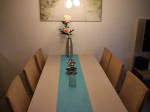 EG: Küche, Backofen mit Ceranfeld, Geschirrspüler, Mikrowelle, Kaffeemaschine, Toaster, Wasserkocher und Waffeleisen, alle notwendigen Utensilien & viele Extras. Kombinierter Wohn- und Essraum, Stereoanlage, großer 3D LED TV mit Blue-Ray-Player, Essplatz mit Kinderstuhl, Doppelschlafcouch. Großzügiges Bad, behindertenfreundlich mit ebenerdiger Dusche. Fliegengitter vorhanden. Alle Türen im EG sind extrabreit. Terrasse mit kleinem Garten inkl. Tisch, 6 Stühle & 1 Liege inkl. Auflagen, Sonnenschirm und Grill im vorhandenen Abstellraum.