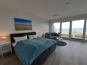 Die Panoramafensterfront im großzügigen Wohn-/Schlafraum sorgt für viel Helligkeit im Raum und bietet ebenso wie die davor gelegene Dachterrasse eine wunderbare Aussicht auf die Ostsee und den Strand.