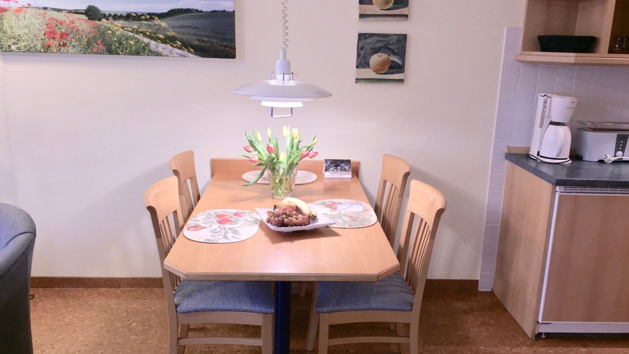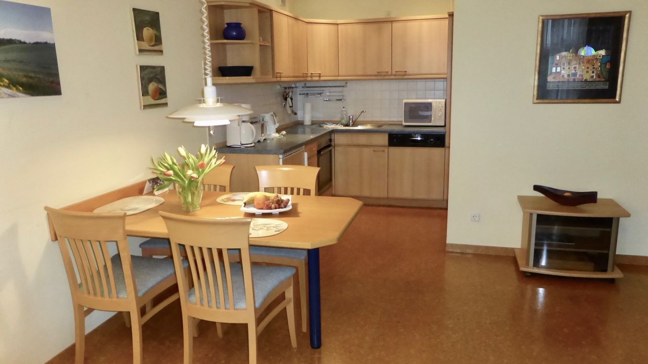 Diese komfortable Nichtraucher-Ferienwohnung ist für bis zu 4 Personen und vor allem für Familien gut geeignet. Sie ist ausgestattet mit zwei hintereinander liegenden Schlafzimmern, einem gemütlichen Wohnzimmer, einer komplett eingerichteten Küche, einem großzügigen Badezimmer mit viel Abstellfläche, einem separaten Gäste-WC und einer Sonnenterrasse mit Blick auf die Binzer Bucht. Die Wohnung ist mit allergikerfreundlichem Korkboden ausgelegt. Handtücher werden wöchentlich kostenlos gewechselt
