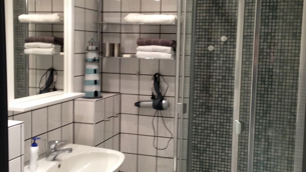 Im modernen Badezimmer finden Sie ein Hänge-WC, einen Fön und eine große Dusche.