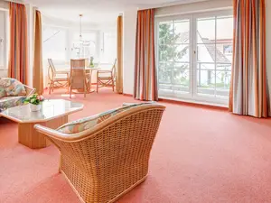 Das Apartment mit Terrasse für bis zu vier Personen ist geschmackvoll eingerichtet mit handgefertigten, mediterran anmutenden Rattanmöbeln in sommerlichen Farben.