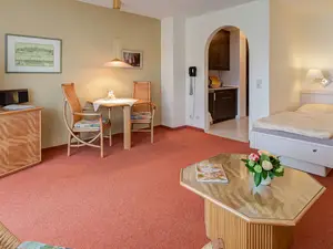 Unser Appartementhaus in zentraler Lage und doch in ruhiger Umgebung lockt mit herrlicher Sicht über die Dächer von Grömitz hinaus bis auf die Ostsee. Gleich vis-a-vis beginnt der Kurpark.Das Apartment ist liebevoll eingerichtet mit handgefertigten, mediterran anmutenden Rattanmöbeln in sommerlichen Farben. Flachbild-TV mit Kabelanschluss, Radio mit CD und MP3, WLAN-Internet-Anbindung sowie Telefon gehören zum Komfort der Ferienwohnung. In der Küche befindet sich ein Herd, Kühlschrank + Gefrierfach, Toaster, Wasserkocher und Kaffeemaschine.