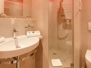 Etwas Besonderes sind die Badezimmer. Eine extravagante LED-Beleuchtung verzaubert den Badaufenthalt rundherum. Sie können wählen zwischen einer hellen Beleuchtung oder einem angenehmen Schlummerlicht in einer von 5 wählbaren Farben bzw. automatischem Farbwechsel. Spielen Sie mit den Farben des Lichtes, großzügige Spiegel vergrößern den Raum und ebenerdige Duschen verlocken zu einem „Duschspaziergang“.
