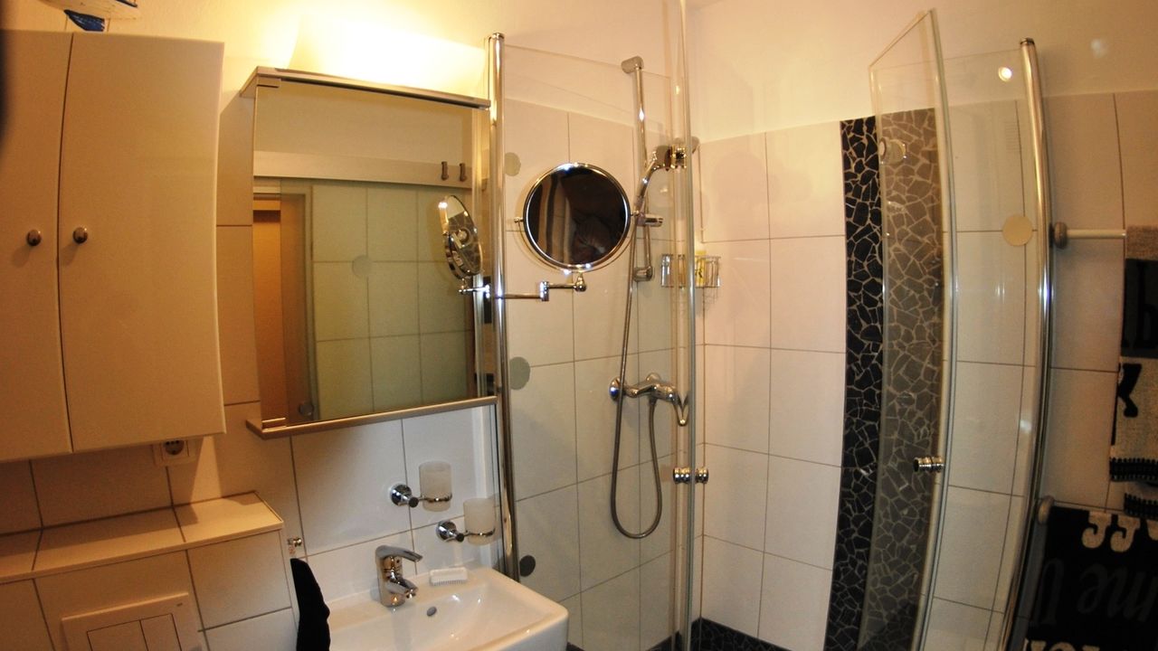 Die Dusche hat ein Maß von 0,90 x 1,10 m