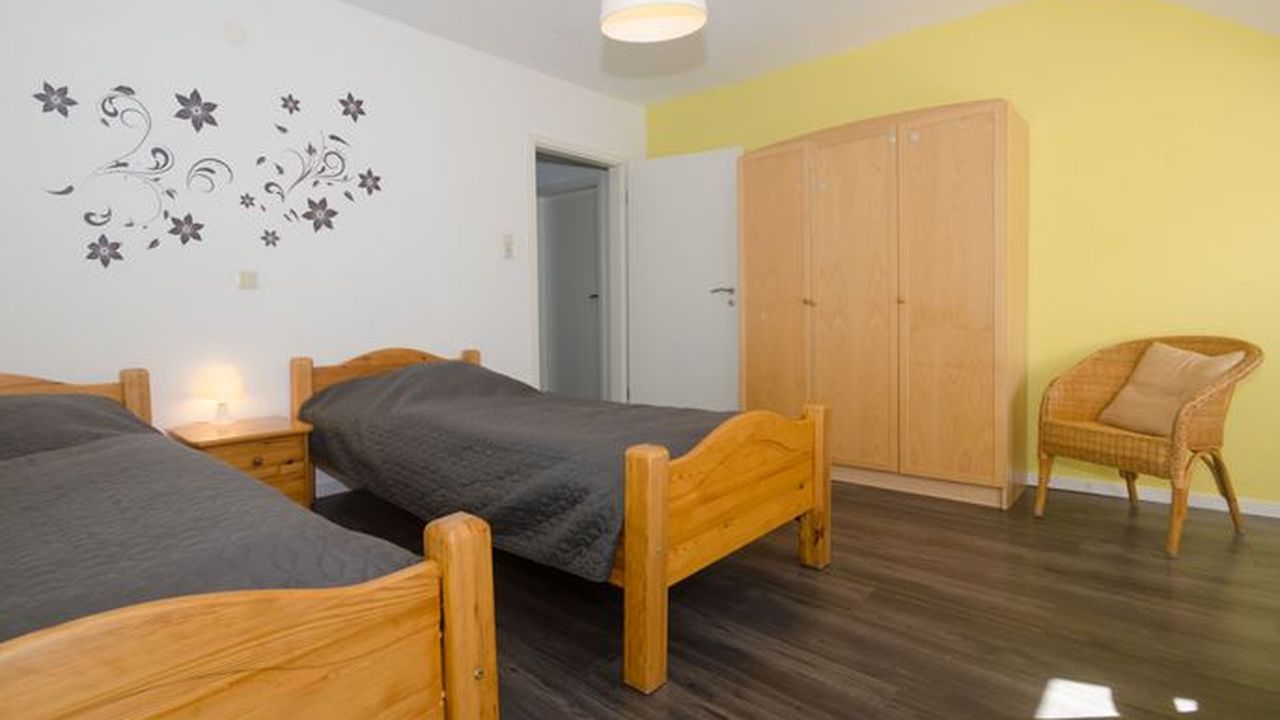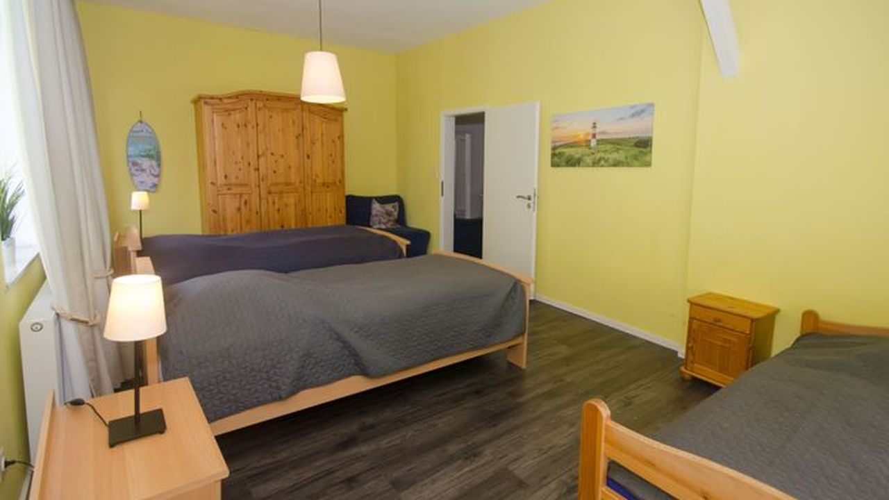 Insgesamt stehen sechs Schlafzimmer mit jeweils zwei Betten und drei Badezimmer zur Verfügung. Ebenfalls ein separates WC. Das Erdgeschoss bietet Ihnen: Eine Küche mit Wohnraum (ca. 75 qm), Einbauküche mit Kochceranfeld und Backofen, Kühl- und Gefrierkombination, Spülmaschine, Mikrowelle, Kaffee-Padmaschine, Toaster, etc., mehrere gemütliche Sitzecken, Flachbild TV, Radio mit CD Player, Bad 1 mit begehbarer Dusche, WC, Badewanne, Waschmaschine mit Wäschehalter, Fön, Handtuchhalter, Schlafzimmer 1 mit großem Doppelbett (1,80 x 2 m), Schlafzimmer 2 mit zwei Einzelbetten, Schlafzimmer 3 mit zwei Einzelbetten und eigenem Zugang zum Bad 2 (Dusche/WC), Diele mit Treppenaufgang. Im Obergeschoss befinden sich: Schlafzimmer 4 mit einem französischen Bett (1,40 x 2 m), Schlafzimmer 5 mit zwei Einzelbetten, Schlafzimmer 6 mit zwei Einzelbetten, Bad 3 mit Dusche/WC, zwei Waschbecken und Handtuchleiter. ACHTUNG: Nebenkosten (Strom und Gas) sind nicht im Preis inklusive und werden separat abgerechnet. Bettwäsche und Handtücher können für jeweils 10,00 Euro pro Person dazu gebucht werden. Eine skandinavische Grillkota kann optional hinzu gemietet werden.Sonstiges