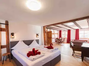 Unser 3-Zimmer Bio-Appartement bietet mit ca. 90 m2 genügend Platz für 2 bis 4 Personen und einem Baby/Kleinkind im Gitterbett. Sie liegt im Haupthaus im historischem Fachwerk aus dem Jahr 1641. Im Juli 2018 haben wir die Wohnung nach ökologischem Standard renoviert, die Wände mit Kalk, Kiesel und Sand verputzt, den Boden mit geöltem Tannenholz ausgestattet. Moderne und antike Möbel verleihen der Wohnung einen besonderen Charme. Das Appartement ist mit 5 Sternen klassifiziert und erfüllt höchste Qualitätsstandards. Inclusiv-Leistungen: W-Lan, Parkplatz, Leihfahrräder (nach Verfügbarkeit), Nutzung Spa- und Wellnessbereich mit Bademantel und Saunatuch.Beschreibung der Unterkunft
