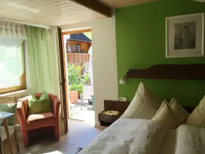 Alfreds Bastelstube ist ein sehr helles Zimmer mit großer Terrasse im Hochparterre des Hauses. Der Name stammt aus der Zeit, als der Hausherr, Zimmermann und Imker Alfred Lehmann, hier sein Arbeitszimmer hatte. Heute buchen Senioren oder Familien mit Kindern gerne dieses freundlich eingerichtete Doppelzimmer mit Flachbildfernseher. Eine kleine Küchenzeile mit Pad-Maschine(Filter-Kaffemaschine ebenfalls möglich), sowie ein Kühlschrank machen dieses Schmuckstück auf Wunsch zu einem idealen Zimmer für Selbstversorger. Gerne können Sie den Wellnessbereich bei uns im Haus für sich privat buchen: Sauna, Whirlpool und Solarium erwarten Sie. Hunde sind in diesem Zimmer auf Anfrage willkommen. Nichtraucherzimmer (auf der Terrasse erlaubt).Beschreibung der Unterkunft
