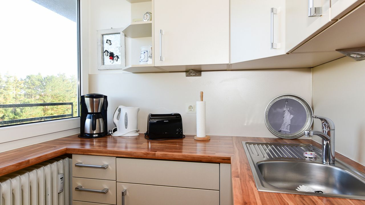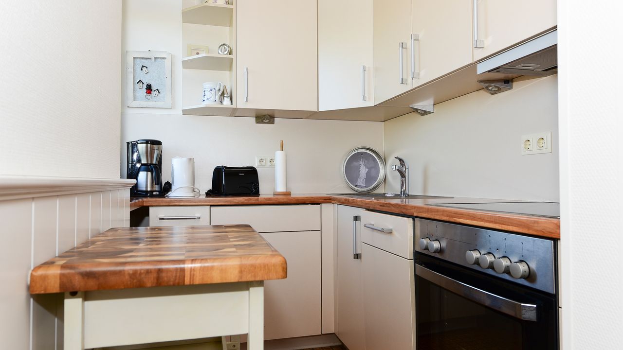 Die separate, kleine Küche ist komfortabel ausgestattet mit Ceranfeld, Spülmaschine, Backofen und Kühlschrank mit Gefrierfach – hier können Sie ganz nach Belieben Ihre Mahlzeiten zubereiten.