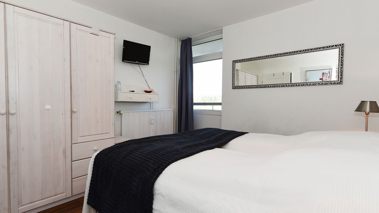 Das Schlafzimmer ist ein weiteres Highlight: Das gemütliche Doppelbett mit hohem Einstieg und elektrisch verstellbaren Lattenrosten sorgt für erholsamen Schlaf. Ein großer Kleiderschrank bietet Platz für Ihre Urlaubsgarderobe, und auch hier erwartet Sie ein zweiter Flachbildschirm. Vom Schlafzimmer aus haben Sie Zugang zu einem zweiten kleinen Balkon.