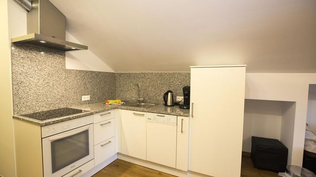 • Küche voll ausgestattet (2-Platten-Herd, Kühlschrank, Kaffeemaschine, Wasserkocher, Geschirrspüler, Töpfe, Geschirr)