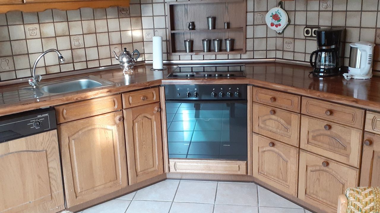 Die Küche ist vollständig ausgestattet mit E - Herd mit Ceranfeld, Backofen, Kühlschrank, Microwelle, Kaffeemaschine, Wasserkocher, Radio und großzügischer Sitzecke.