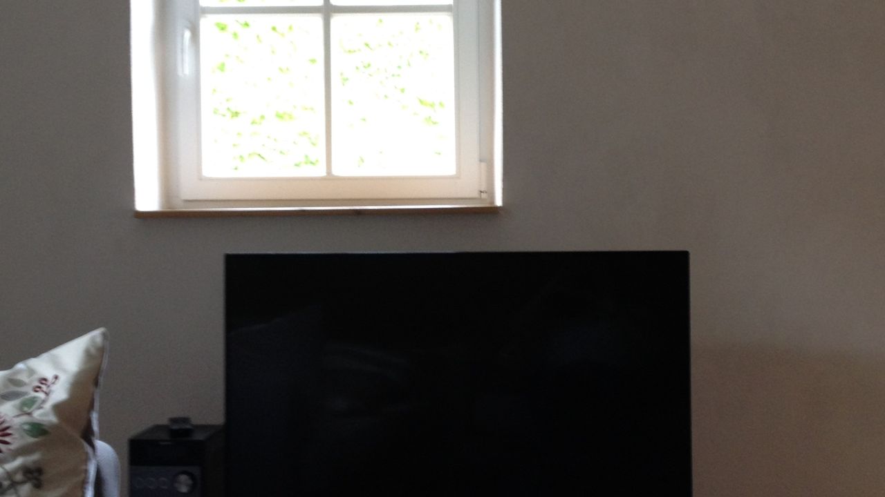 Dem Wohnzimmer verleiht eine Bruchsteinwand ganz besondere Atmosphäre. Ein großer LED-Fernseher, ein DVD-Player und eine Musikanlage sorgen für Unterhaltung.