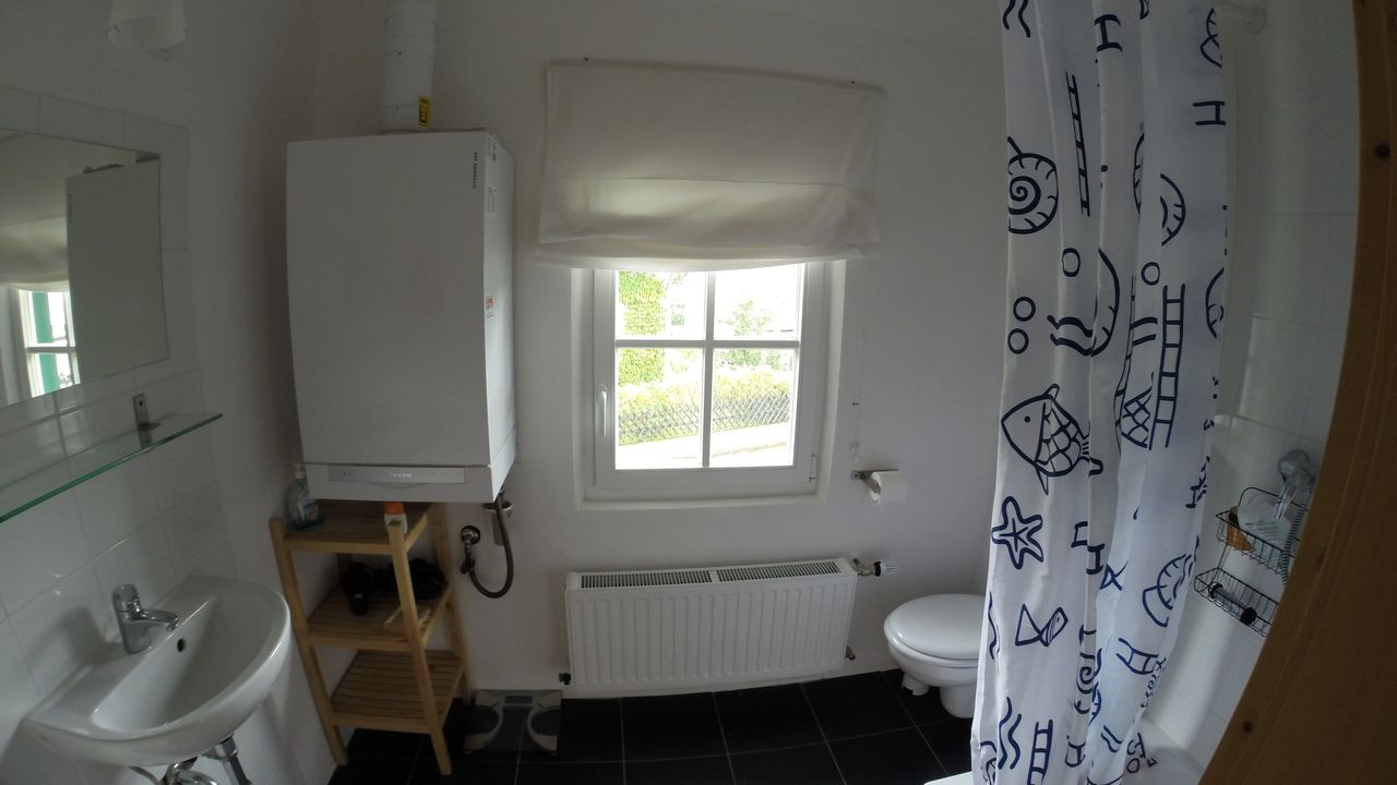 Auch das Bad im Erdgeschoss hat eine Bruchsteinwand. Hier kann man in der Badewanne entspannen.