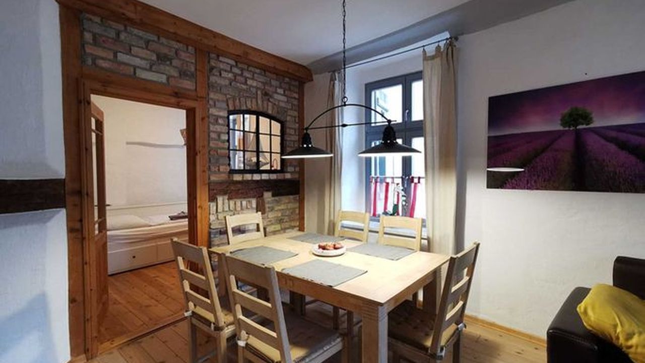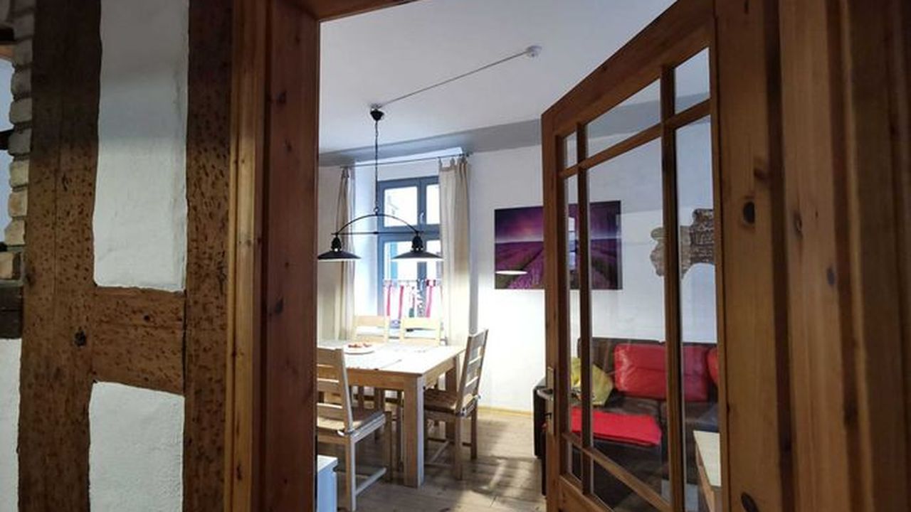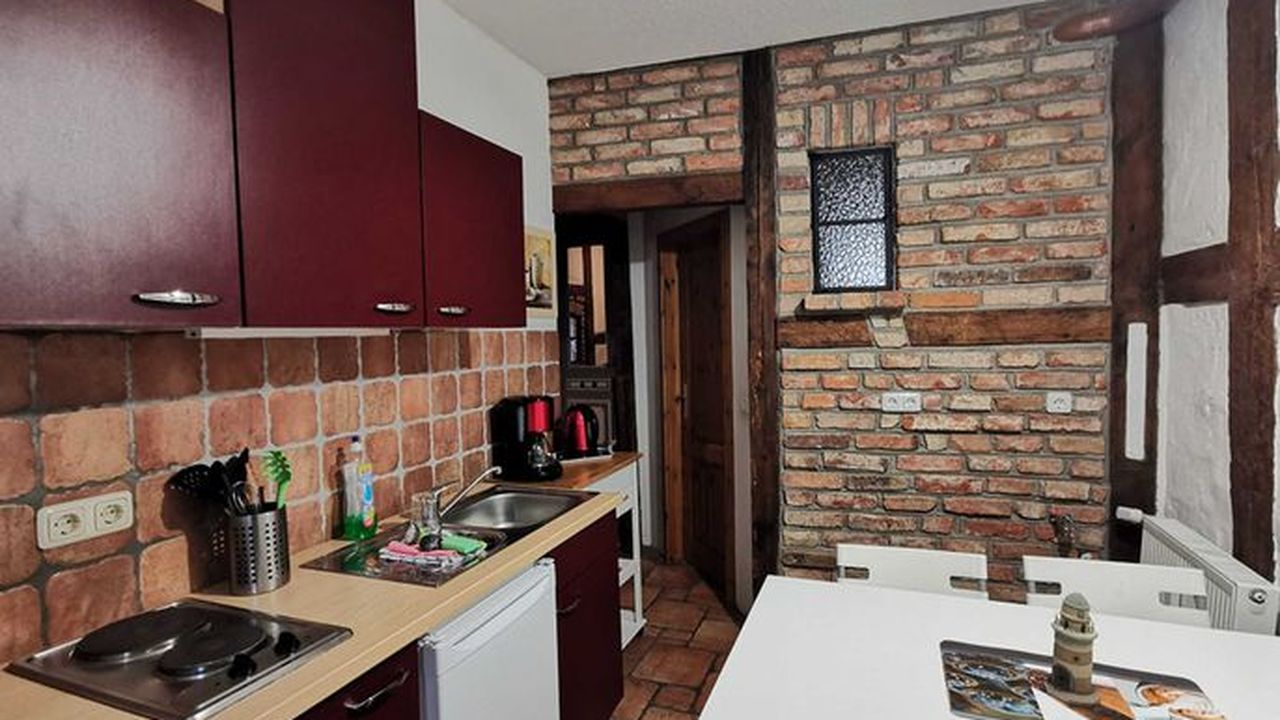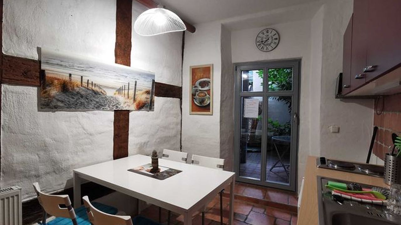 Unsere Ferienwohnung (ca 70 m²) befindet sich in der Frankenstr. 49 im Erdgeschoss, direkt in der Altstadt in Hafennähe. Sie verfügt über ein Wohnzimmer mit großem Esstisch für 6 Personen und 2 Schlafzimmer. Die Aufbettung für die 5. und 6. Person befindet sich auf der Schlafcouch im Wohnzimmer. Die Küche mit Einbauküche und großem Esstisch hat Zugang zur Terrasse, mit Blick zum historischen Innenhof. Das Bad ist gefliest mit WC und Dusche.Ausstattung
