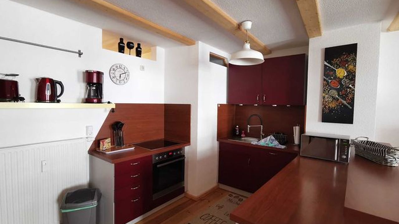 Küche: Microwelle, Kaffeemaschine, Wasserkocher, Toaster, Herd & Backofen, Tresen, Kühlschrank