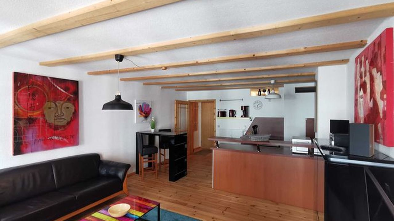 Wohnzimmer: großer Wohnraum mit offener Küche, Couch für 2 Personen, TV, erhöhte Sitzecke