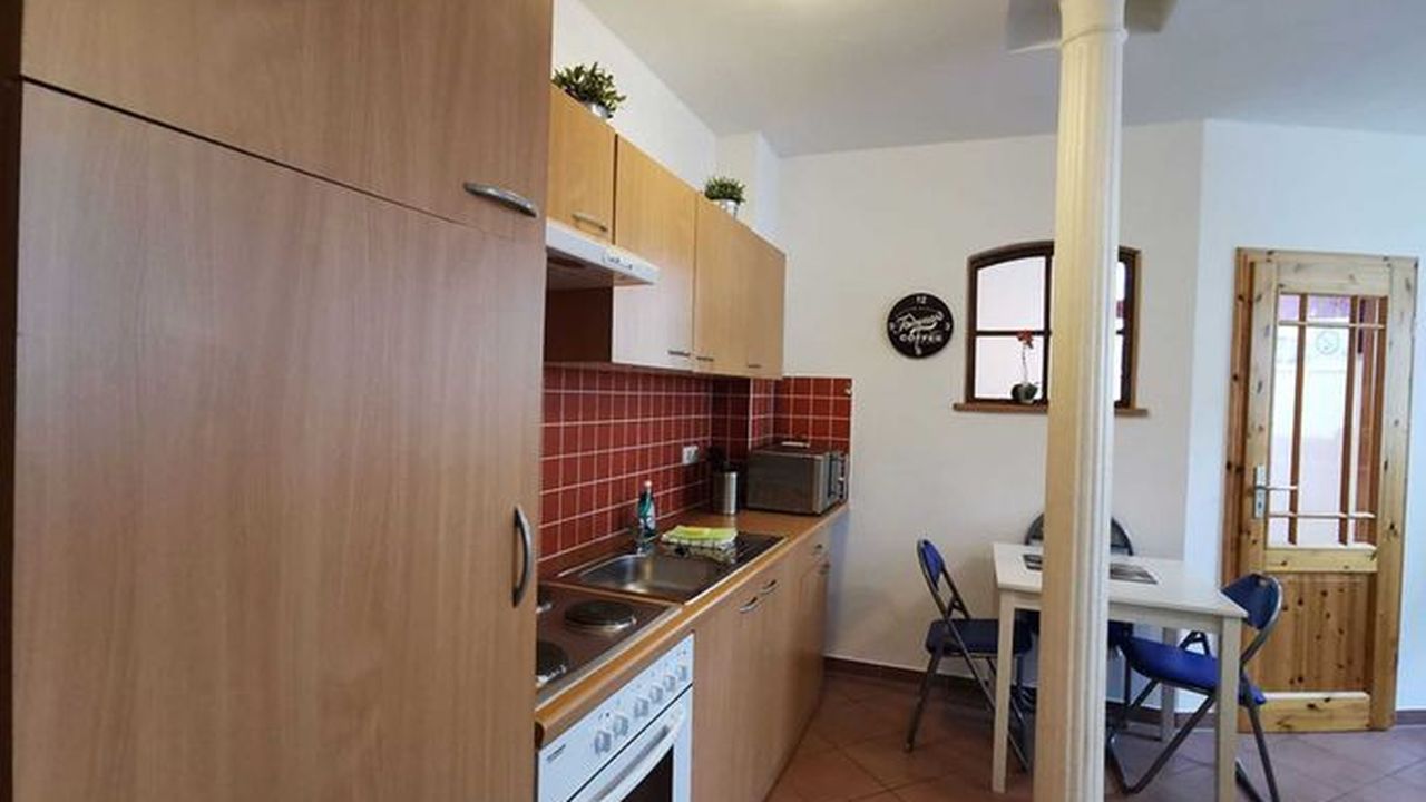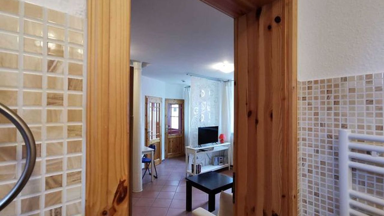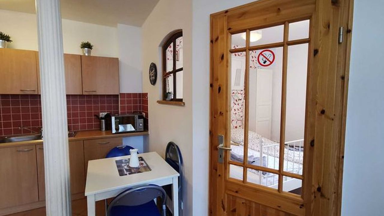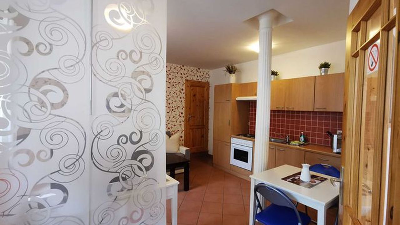 Die Ferienwohnung verfügt über ein Wohnzimmer mit offener Küche und einem Schlafzimmer mit Doppelbett.
