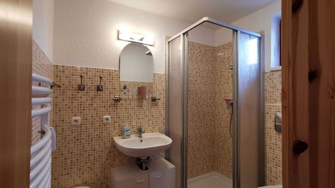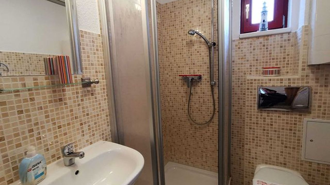 Das Bad ist gefliest, mit Dusche und Fenster.