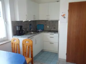 Im EG befinden sich das in 2021 renovierte Duschbad mit Fenster und das in 2020 renovierte Wohnzimmer mit eigener, eingezäunter Terrasse (Zaunhöhe ca. 1m). Es ist eingerichtet mit 1 Sofa mit Schlaffunktion , 2 Sesseln, SAT-TV, Esstisch mit Stühlen und offen zur ebenfalls in 2020 renovierten Küche mit Dunstabzugshaube, Backofen, Geschirrspülmaschine, Mikrowelle, Cerankochfeld, Kühlschrank mit Gefrierfach, Kaffeemaschine, Wasserkocher, Toaster, Mixer, Eierkocher und Geschirr.
