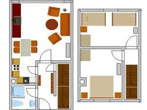 Das Ferienreihenhaus verfügt über 2 separate Schlafzimmer mit 1 Doppelbett bzw. 2 Einzelbetten (2m lang) in der 1. Etage. Für die 5. Person steht ein Gästeklappbett und für alle Gäste stehen synthetische Bettdecken und Kopfkissen zur Verfügung.