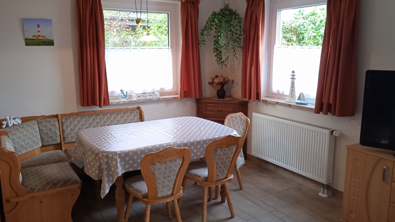 Das Wohnzimmer (ca. 30m²) hat eine Südwestterrasse, 1 Ecksofa mit Schlaffunktion (für 1 Person), 1 Sessel, SAT-TV, eine Essecke und