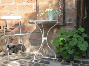 Kleine Terrasse: auf der Gartenseite mit kleinem Tisch und 2 Stühlen, Grillmöglichkeit