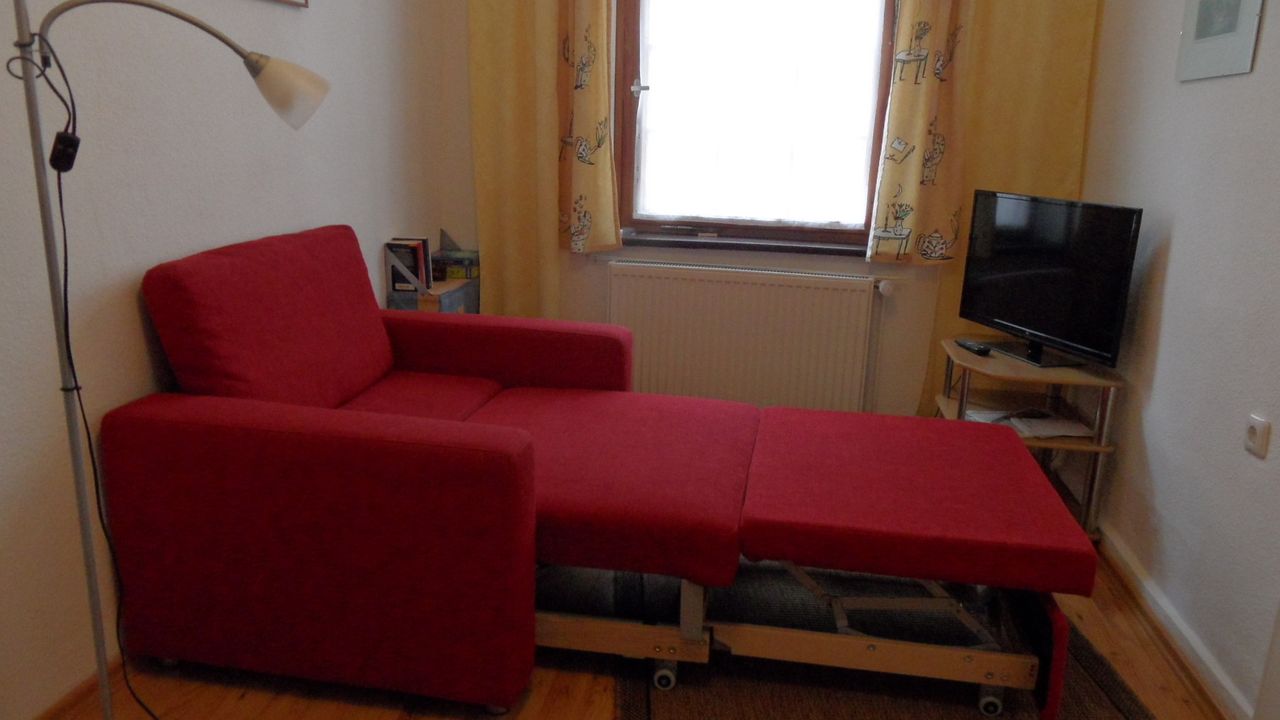 Von dem behaglichen kleinen Sofa (Loveseat) im Wohnzimmer schauen Sie durch das große Sprossenfenster auf die ruhige Gasse hinaus. Das kleine Sofa ist 1,20 m breit und bietet Ihnen - halb ausgezogen - eine Relaxfunktion zum Beine hochlegen.