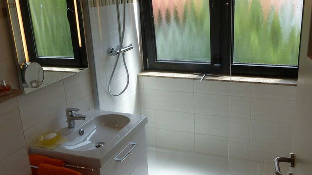 In 2017 renoviertes Badezimmer mit begehbarer Dusche. WC und Waschbecken mit Schrank.