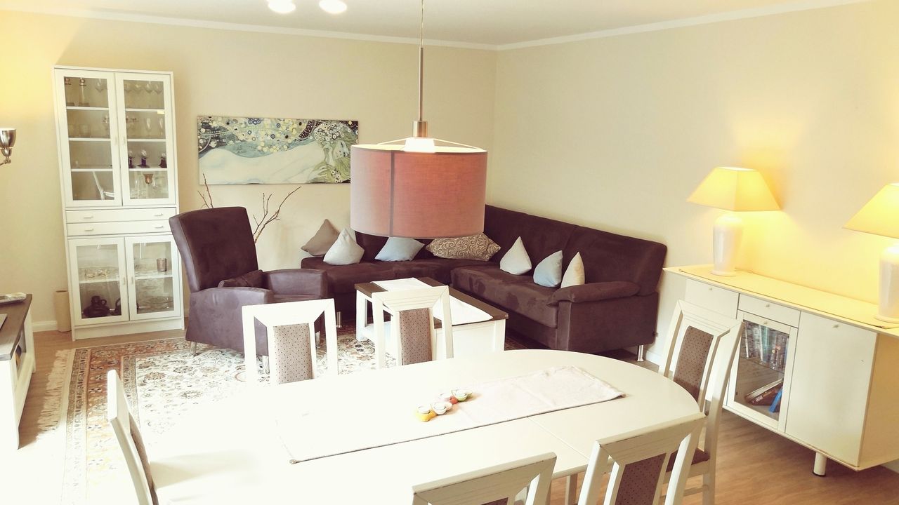 Die Erdgeschosswohnung ist 100 m² groß. Im geräumigen Wohn- und Essbereich finden Sie eine gemütliche Couchgarnitur, einen Flachbildfernseher, sowie einen großen Esstisch . Von hier aus haben Sie auch Zugang zur großen geschützten Terrasse mit Blick auf die Dünen.